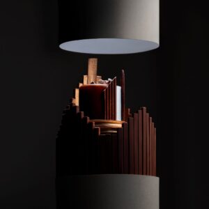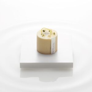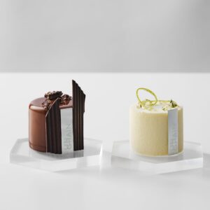 柑橘の果実や花のような香りが特徴のカカオハンターズ「エレガンテ」を使用し、オレンジの爽やかな酸味とヘーゼルナッツの香ばしく濃厚な味わいを様々なパーツに施し、層を重ねました。ひと口サイズに凝縮された気品ある味わいと、つややかで美しくたたずむシルエットが、高貴なチョコレートの世界を表現しています。