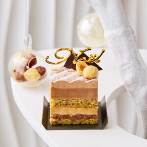 スミレの華やかな香りが広がるしっとりとしたバニラ風味の生地に、香ばしいヘーゼルナッツのクルスティアン、爽やかな柚子のクリーム、洋梨とカモミールのジュレを忍ばせました。